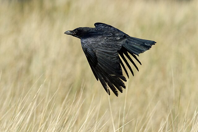 Crows are large, all-black birds with a heavy, straight bill. In flight, their tail is typically rounded or square-tipped, which helps distinguish them from the larger Common Raven, found primarily in Northern Wisconsin, whose tail is wedge-shaped.